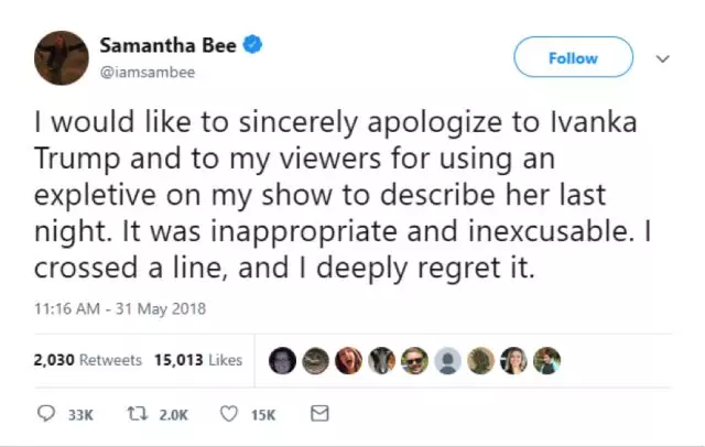 而在白宫的斥责下,TBS电视台迅速从自己所有的平台上撤下了这起节目,并和闯祸的主持人萨曼莎一起向伊万卡道了歉。其中萨曼莎在自己的道歉贴文中表示:"我真诚地向伊万卡和我的观众道歉,我的用词太不合适了,我越线了,我对此深感遗憾。"