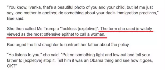 而在昨天美国主流电视台TBS播出的一档脱口秀节目中,节目主持人萨曼莎·比(Samantha Bee)在谈到此事时就情绪十分激动,然后她就把特朗普与此事并没什么关系的女儿伊瓦卡在节目中拉出来"批斗"了一番。